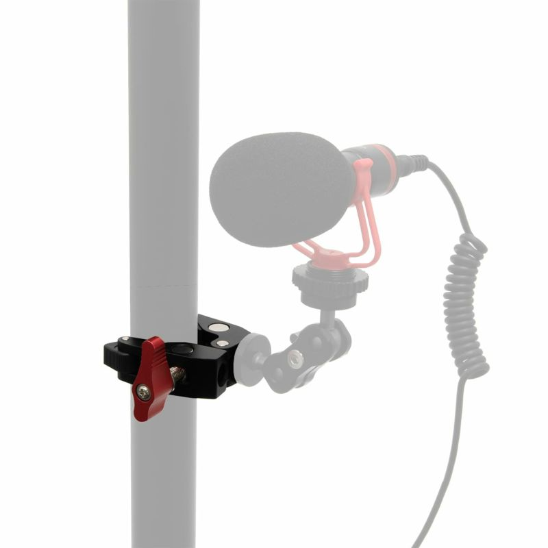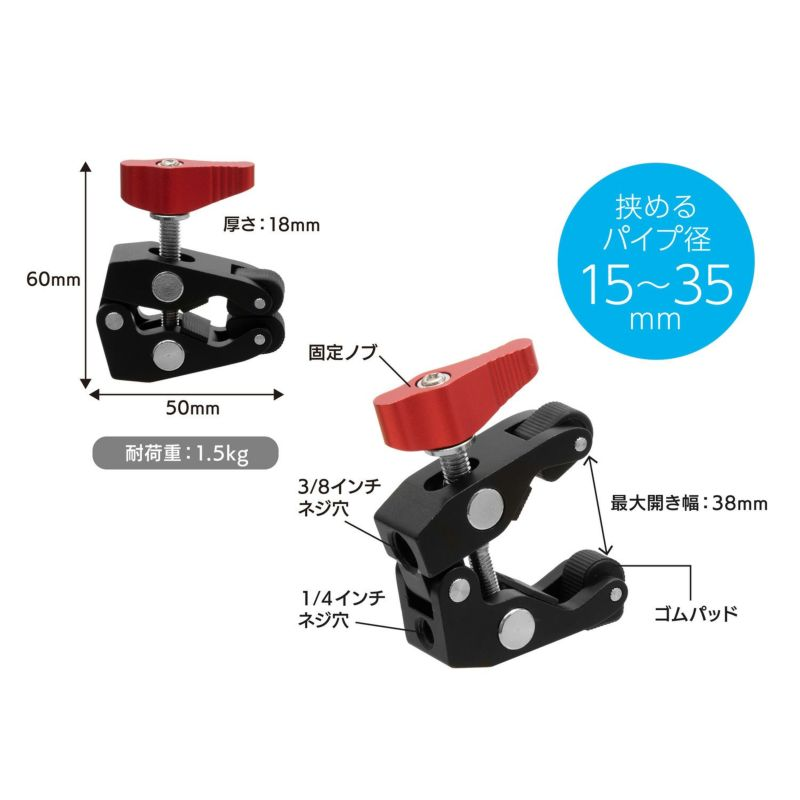 King MC-S は、2種類(1/4インチ, 3/8インチ)のネジ穴がついたアルミ製クランプです。別売りのマジックアームなどと組み合わせてモニターやライトといった各種アクセサリーを三脚の脚、ライティングポール、テーブルなどに固定することができます。挟み込む部分を可動式に、接触面をゴム製にすることで、挟む相手側の形状に合わせてしっかりと固定でき、傷が付きにくい仕立てです