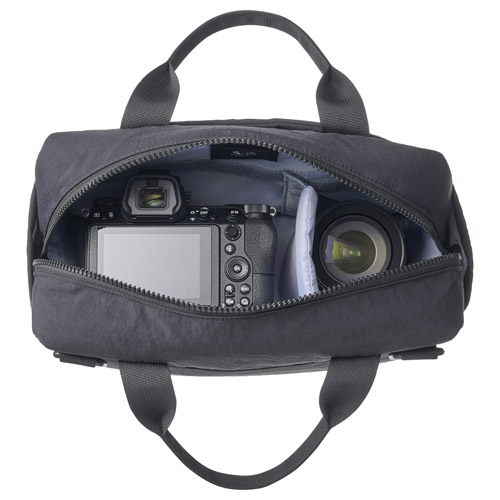 ・メイン収納部にはミラーレス一眼カメラと交換レンズ1本の収納が可能です。機材に合わせて自由に位置調整できる中仕切りが1枚付属します
