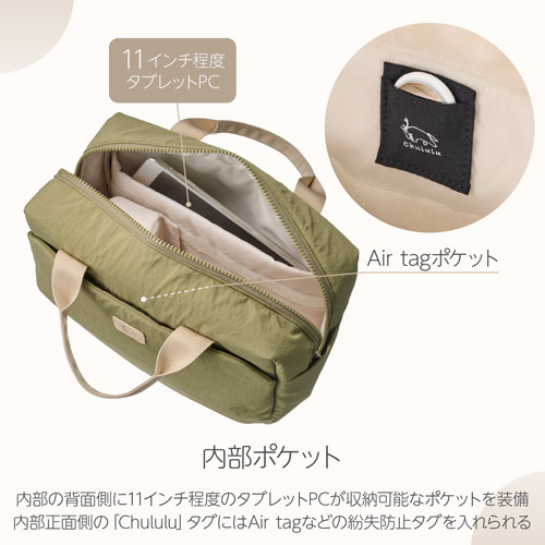 ・内部正面側にある「Chululu」タグは、AirTagなどの紛失防止タグを入れられる隠しポケットになっています