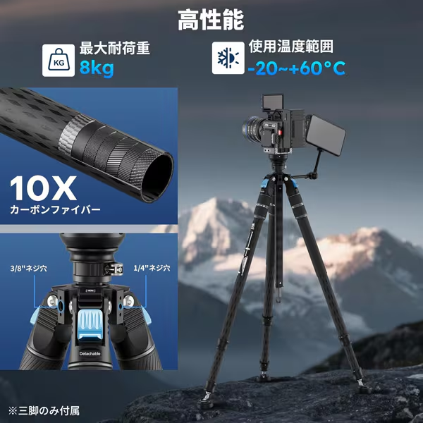 | 仕様・特徴 | 【脚部】 ●素材:カーボン ●段数:3段 ●耐荷重(推奨積載質量):8kg ●重量:2.3kg ●脚ロック方式:ハンドルツイストロック ●全高:1650mm ●最低高:195mm ●縮長(折りたたんだ長さ):680mm ●最大パイプ径:19mm~30mm ●エレベーター長:310mm ●レベリングベース:直径60mm/調整可能角度±15° ●石突:可動式ラバーフット(直径50mm) ●カラー:ブラック ●付属品:交換用スパイク、一脚化用アダプタ、六角レンチ、保証書、キャリーバッグ、説明書、合格証 【ビデオ雲台】 ●素材:アルミ合金 ●耐荷重(最大積載重量):2.5-6kg ●重量:0.76kg ●全高(高さ):100mm ●ベース部直径:60mm ●チルト:-50/+90° ●パンニング:360° ●水準器:あり ●パン棒:350mm ●専用クイックシュー:50x90x12mm ArcaSwiss規格準拠 ●カラー:ブラック ※こちらの商品はお取り寄せとなります |