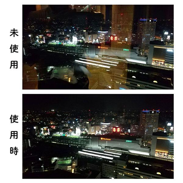 シリコン製フードがガラス面に密着し、ガラスに映る周辺の映り込み、レンズの周囲から入り込む光を防ぎます
