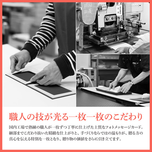 | 仕様・特徴 | 【感謝の想いを伝えたい様々なシーンに】 ちょっとしたお礼から、お祝いなど、いろいろな場面でご活用いただけます。 カードの洗練されたデザインは、感謝の気持ちをより一層上品に伝えます。 【卒業】 卒業する仲間同士でこれまでの感謝を贈り合ったり、お世話になった先生へ感謝を伝える際に。 卒業当日の晴れやかな写真に心を込めたメッセージを添えて贈ることで、共に過ごした大切な思い出を、心に残る特別な形で残すことができます。 【誕生日】 誕生日を祝ってくださった方へお礼を伝えたり、祖父母へ孫の成長の感謝を届けたりする際に。記念の写真に温かなメッセージを添えて贈ることで、 喜びを鮮やかな思い出として残すことができます。 【結婚式】 結婚式の開催を支援してくださったご両親やご親戚へ、式当日の特別な写真に、感謝の気持ちを綴ったメッセージカードを添えて贈ることで、深く心に残る贈り物となります。 【しなやかで柔らかい上質なタント紙を使用】 素材には、表面に控えめな凹凸のエンボス加工が施された、高級感あふれるタント紙を使用。手に取った際に感じるしなやかで柔らかな質感は、贈り主の温かな想いを伝えてくれます 【落ち着いたクラシックデザインの手書き用メッセージカード付き】 中額にぴったり収まるサイズの、手書き用メッセージカードが付属しています。落ち着いたクラシック調の装飾を施したデザインで、写真とともに贈るメッセージを上品に引き立てます。 【タテ・ヨコどちらの写真にも対応するスクウェアタイプ】 写真の向きに合わせてセットできるタテヨコ兼用のスクウェアタイプ。気持ちを伝えるメッセージといっしょに写真を贈る『フォトメッセージカード』です。 両面に写真をセットすることも可能。贈るシーンや伝えたい想いに合わせて、自由に組み合わせることができます 【仕様】 二つ折り、タテヨコ兼用、メッセージカード付き 対応写真サイズ Lサイズ(W89×H127mm) 表紙材質 紙 表紙厚 約1mm 外寸法 約W165×H163×D5mm 中額仕様 ビク抜き 中額中抜き寸法 約W78×H115mm ※こちらの商品はお取り寄せとなります |