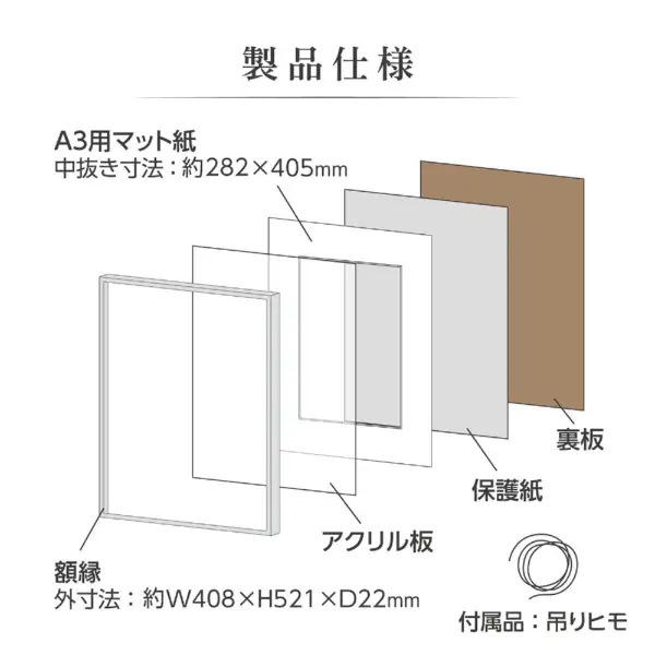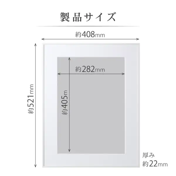 | 仕様・特徴 | フレーム材質 アルミ製 額縁外寸法 約W408×H521×D22mm マット外寸法 約W404×H517×D2mm マット中抜寸法 約W282×H405mm マット仕様 Vカットマット紙・ワイドマット台紙 前面板:アクリル 重量 約1300g 吊りヒモ:あり スタンド:なし ※こちらの商品はお取り寄せとなります |