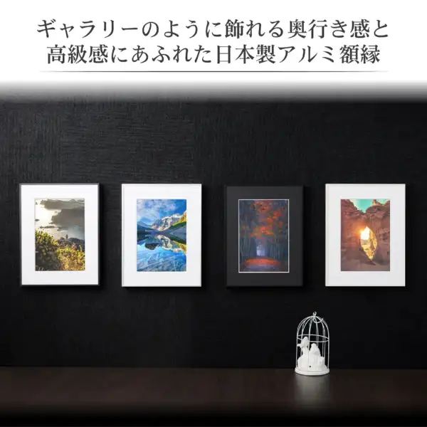 細身のフレームとワイドマットが作品を引き立たせる展示会等に最適なアルミ製額縁です。 奥行き感のあるフレームは高品質な日本製。コーナー金具のネジをゆるめて短辺から出し入れができる、位置決めのしやすい差し込み式フレームです。Vカットの中抜き加工により額縁に奥行き感を与え、作品をより引き立たせます。 表面板にはアクリル素材を使用していますので、万が一落下しても安心です。