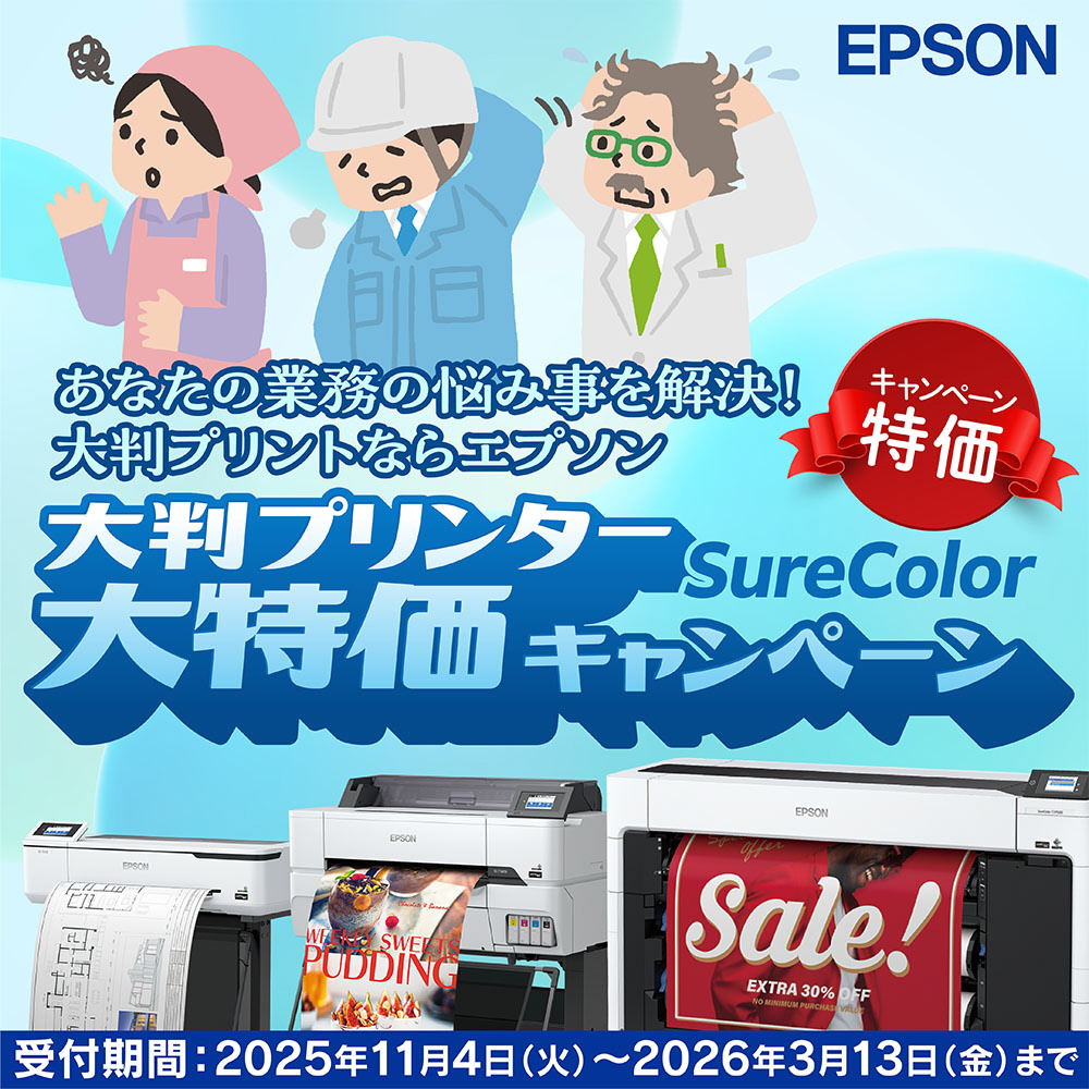 | 注意事項 | エプソン販売株式会社は、業務用の水性顔料大判インクジェットプリンター「SureColorシリーズ」を対象とした『SureColor 大判プリンター大特価キャンペーン』を、2025年11月4日より開始します。本キャンペーンでは、POP・ポスター・CAD図面など多用途に対応する高画質・高生産性モデルを特別価格でご提供します。 さらに、ロール紙プレゼントや、お得な搬入メニューもご用意しています。 「SureColorシリーズ」は、エプソン独自の顔料インク技術により、鮮やかな色再現と高耐久性を実現。小売業・建築設計・製造業・教育機関・広告デザイン業など、幅広い業種で導入いただいています。 大判プリンターの入れ替えや新規購入をご検討されているお客様は、この機会をぜひご活用ください。 本キャンペーンでは、2026年1月30日までにご注文いただき、2026年2月27日までに納品いただけるお客様を対象に、搬入費がお得になるキャンペーン限定搬入メニューをご用意しています。また、キャンペーン限定搬入メニューをご利用のお客様に限り、現在ご使用中の対象機種の無償引き取りサービスもご用意しています。時間帯指定の搬入にも対応しており、設置作業の負担を軽減し、店舗や事務所への導入をスムーズに行える特典です。対象期間や型番などの詳細は各モデルのキャンペーンページをご確認ください。 <キャンペーン期間> 受注期間:2025年11月4日~2026年1月30日(注3) 納品期間:2025年11月11日~2026年2月27日 ❖❖❖製品の開梱、指定場所への配置および組み立て、階段作業、梱包材回収をするまでの料金は別途加算されます❖❖❖ |