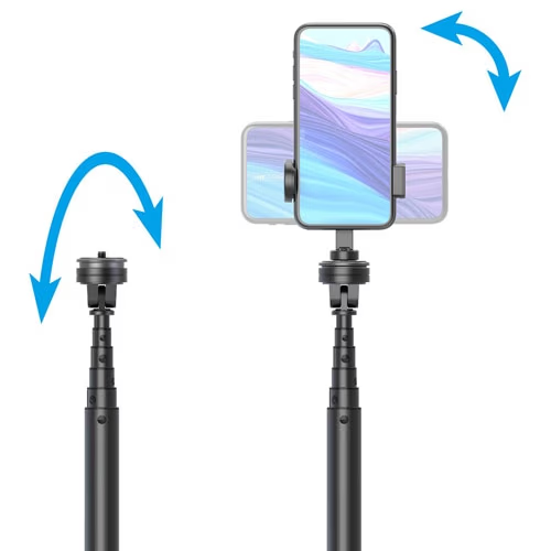 ・カメラネジ付きのティルト雲台を装備。軽量カメラやアクセサリーをセット可能。また縦・横対応のスマートフォンホルダーも付属しています