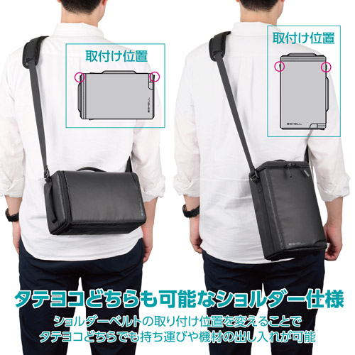 ・付属のショルダーベルトを装着してショルダーバッグとしても使用ができます。ショルダーベルトの取り付け位置を変えることで、タテヨコどちらでも持ち運びや機材の出し入れができます