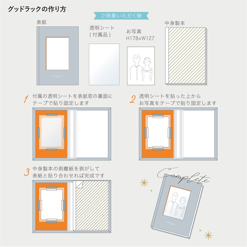 仕様・特徴 | ・外寸:305×217mm ・仕様:表紙のみ/不織布/箱付/透明シート(窓保護用) ・窓サイズ: 165×113(キャビネサイズ) 背幅:6・8・10P-12mm |