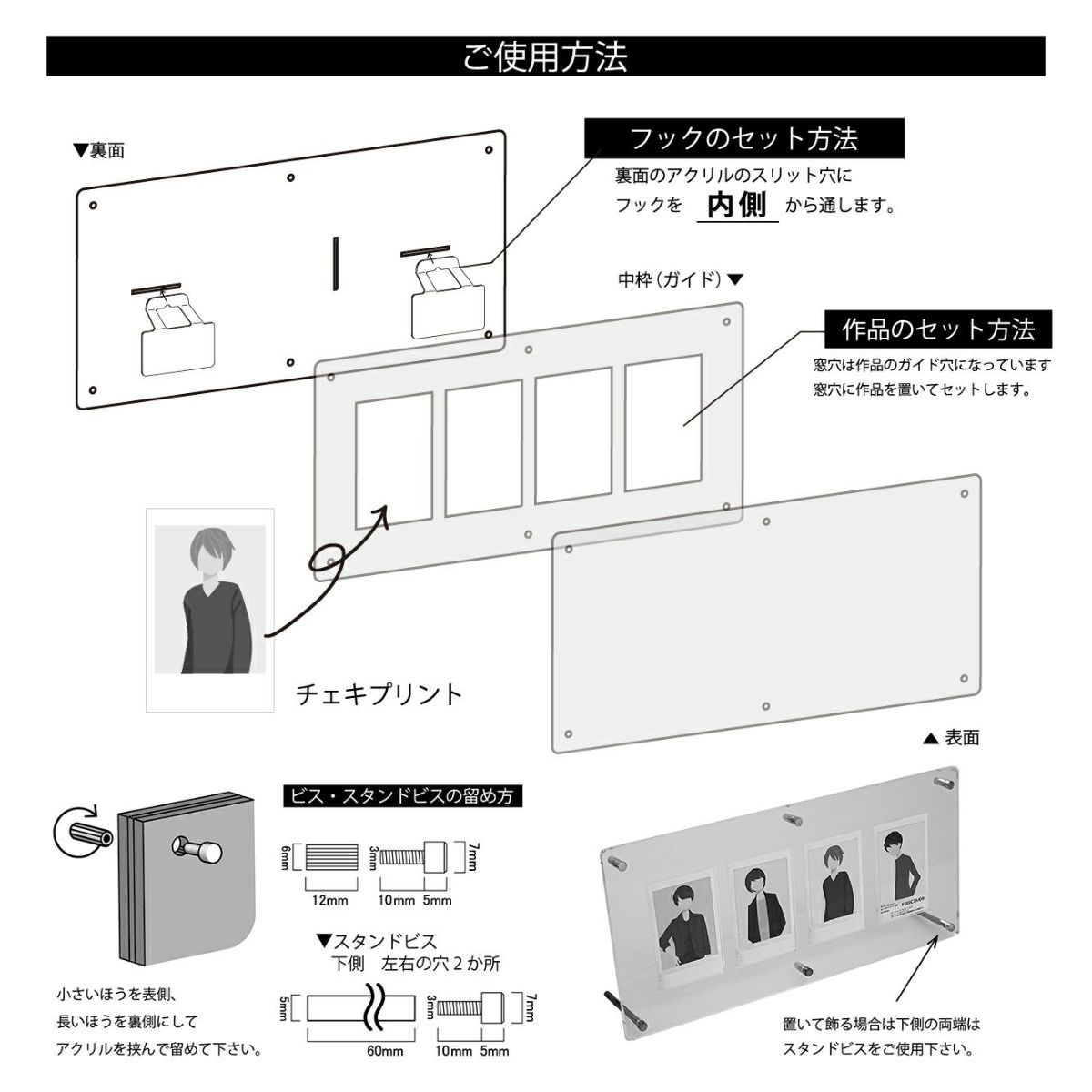 | 仕様・特徴 | チェキプリントを4枚飾る事ができるアクリルフレームです。 中枠(ガイド)で位置を固定するため、フレーム内でチェキがずれません。 縦横兼用で置いて使うだけでなく、壁にかけて展示することもできます。 ■フレーム外寸:315×150×21mm(スタンド含まず) ■フレーム窓寸:54×86mm(×4面) ■重量:245g(スタンド含まず) ■フレーム材質:アクリル ■止め金具、スタンド材質:スチール ■壁掛け用フック材質:PET ■プリント収納枚数:4枚 ※こちらの商品はお取り寄せとなります |