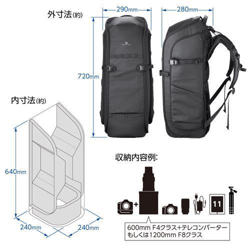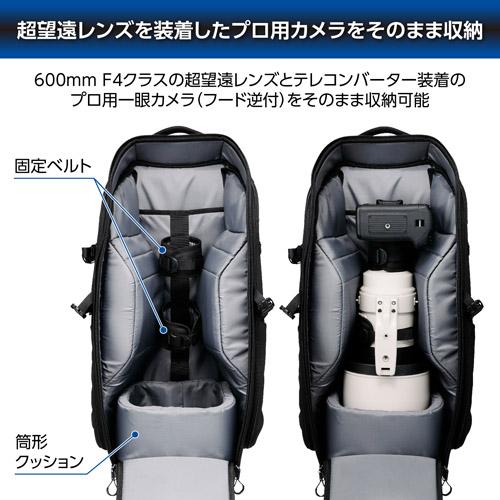 ・「レンズバックパック36」は、大型レンズを運搬するために専用設計され、600mm F4クラスの超望遠レンズとテレコンバーターを装着したプロ用一眼カメラをフード逆付けでそのまま収納が可能な大容量バックパックです。