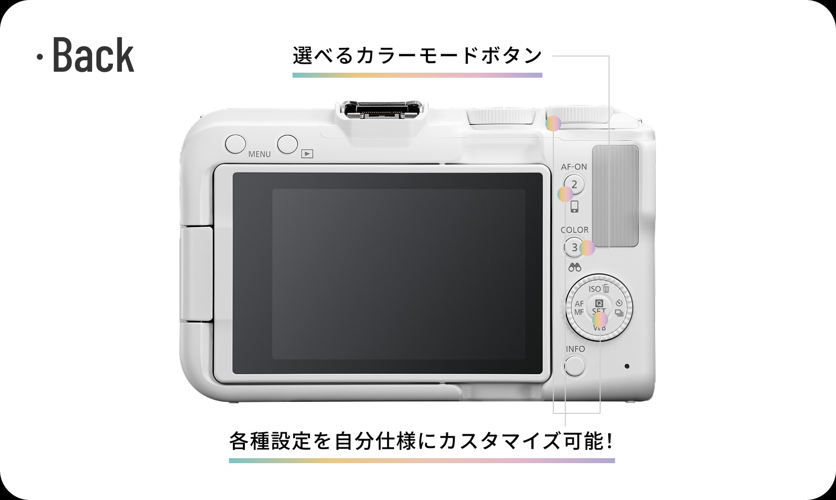 | 仕様・特徴 | レンズマウント キヤノンRFマウント 撮像素子サイズ 約22.3 × 14.9mm カメラ部有効画素 約2420万画素 記録媒体:SDXC/SDHC/SDメモリーカード(UHS-II/UHS-I/UHSスピードクラス/SDスピードクラス対応) フォーカス方式 デュアルピクセルCMOS AF 測距輝度範囲(静止画撮影時:EV-5.0~20 シャッター方式:電子先幕、電子シャッター X同調速度:電子先幕:1/250秒 ボディー内手ブレ補正:なし 対応ストロボ:マルチアクセサリーシュー搭載以外のアクセサリーを使うときには、アダプターAD-E1が必要となります 連続撮影速度:高速連続撮影+:最高約12コマ/秒(電子先幕)、最高約15コマ/秒(電子シャッター) 液晶モニター:3.0 型(画面比率 3:2)/約 104 万ドット バリアングル式TFT式カラー液晶モニター 外部マイク入力端子 Φ 3.5 mm ステレオミニジャック対応(3 極) ヘッドフォン端子 Φ3.5mmステレオミニジャック対応 デジタル端子 端子形状:USB Type-C HDMI出力端子 タイプD(マイクロ) 使用電池 バッテリーパックLP-E17 大きさ:約119.3(幅)×73.7(高さ)×45.2(奥行)mm 重さ:約 370 g(バッテリー、カードを含む)/約 323 g (本体のみ) JANコード: EOS R50Vボディ ホワイト :商品設定無し EOS R50 V RF-S14-30 IS STM PZレンズキット ホワイト:4549292261745 EOS R50 V ダブルズームキット ホワイト:4957792181720 発売予定日:2026年3月下旬 |