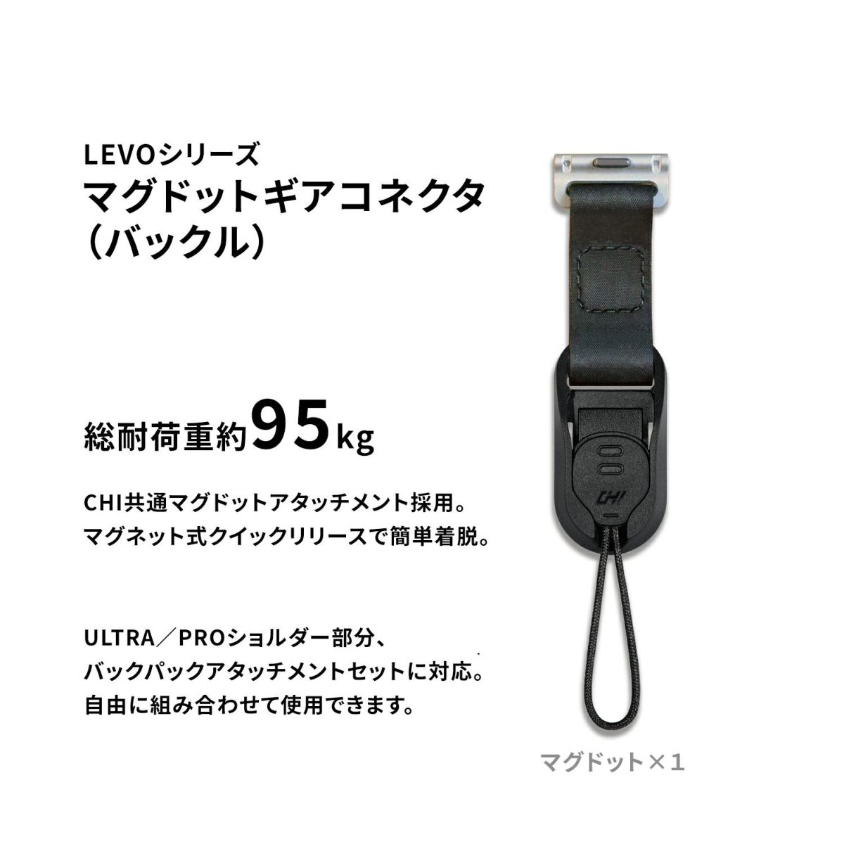 | 仕様・特徴 | CHI共通のマグドットアタッチメント採用。 マグネット式クリックリリースで簡単着脱。 Pro/Ultraショルダー部分、 バックパックアタッチメントセットに対応。 自由に組み合わせて使用できます。 【製品仕様】 サイズ 約9cm×2.9cm 質量 約16g 主素材 航空機グレードアルミ合金(6061-T6)、GF強化ナイロン、304ステンレス鋼、高強度ポリエチレン繊維 付属品 マグドットギアコネクタ(バックル)×1 発売日:2025年12月19日 |
